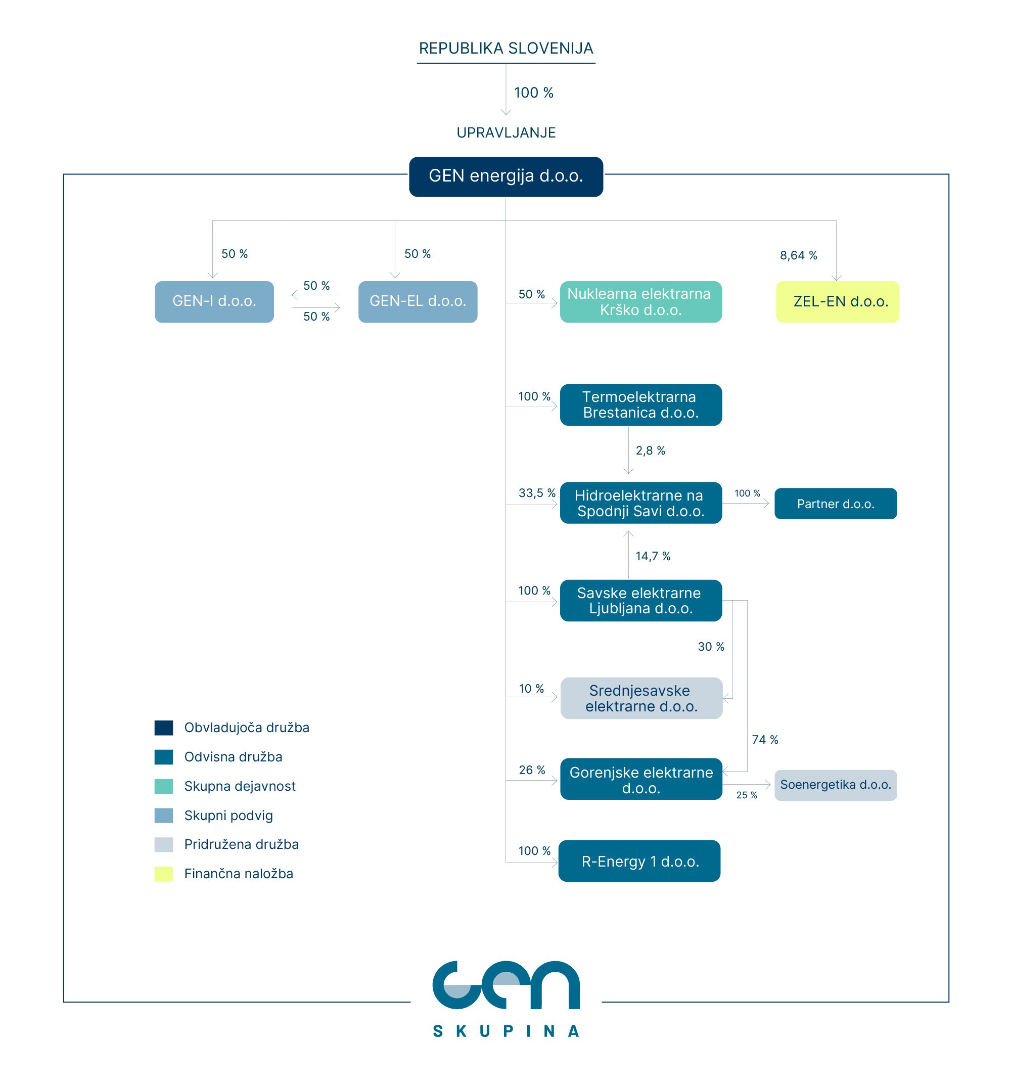 Skupina GEN združuje vodilna slovenska energetska podjetja, ki skupaj ustvarjajo zanesljivo, varno in konkurenčno oskrbo z električno energijo. Naša moč izhaja iz trajnostnih, nizkoogljičnih virov — jedrske, vodne in sončne energije — s katerimi gradimo prihodnost, usmerjeno v stabilno in čisto energetsko okolje.
